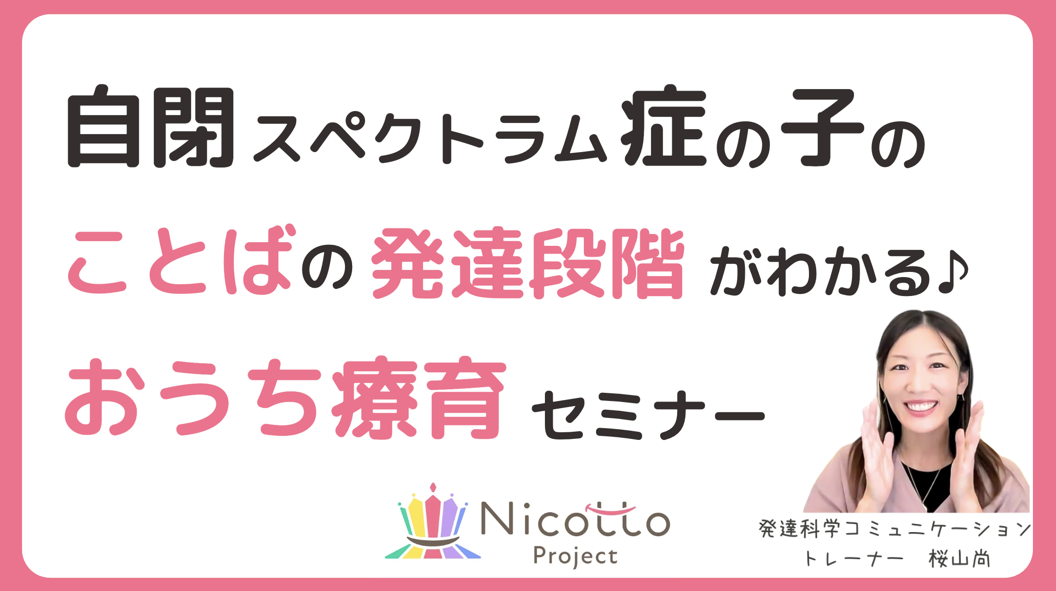 HOME > イベント > 桜山尚無料体験セミナー 2026年3月10日 ▼嬉しい声が続々と届いています^^ 「気持ちが伝わらず癇癪になっていた子が、少しずつことばで伝えてくれるようになりました」(年長男の子のママより) おすすめ無料電子書籍【約10分で読めます】 本をクリックしてダウンロード 開催日: 2026年3月17日 10:00 AM - 10:45 AMカテゴリー: 桜山尚オンラインセミナー 【日時】・2026/03/17(火):10時〜10時45分・2026/03/18(水):10時〜10時45分・2026/03/25(水):11時〜11時45分 ▼詳細・お申し込みはこちらから▼ セミナーに申し込む ことばの遅れや癇癪、こだわりに振り回されて この先どうなるのか不安なママへ 自閉症の特性を和らげるポイントは 「言語発達」です。 この本を読むと ことばを伸ばすおうち療育の テクニックが分かります ▼今すぐ無料で受け取る ことばが遅い自閉症のお子さんの就学 「何を基準に学校を選べばいいの?」 と迷うママへ ▼今すぐ無料で受け取る 学校見学で見るポイントがわかる電子書籍はこちら ▼今すぐ無料で受け取る ▼その他電子書籍はこちら! ▼無料メール講座はこちら! -